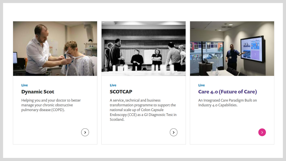 We work extensively with the Scottish Government, NHS, Local Government, Academic Institutions, Commercial organisations (SMEs through to Enterprise-level organisations) and our Citizens, who are at the heart of what we do and why we do it. This approach has led to the development, adoption and scale of projects like The Scottish Capsule Programme (SCOTCAP).